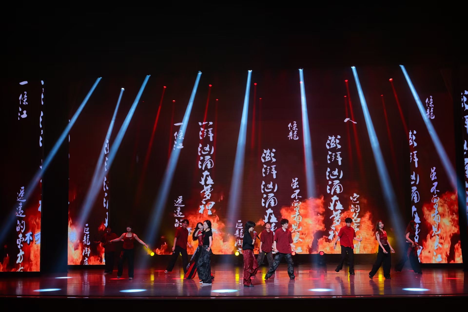 晚会以《古韵傩魂》《光影交织的梦》《龙》《咏春》等节目为亮点,构建起传统艺术现代表达的教学实践范本。国家级非遗傩舞通过互动表演打破舞台边界,让千年文化与当代观众零距离对话;原创微音乐剧《光影交织的梦》由学生自编自导,探讨非遗传承的守正创新命题;说唱节目《龙》将说唱音乐与龙纹图腾结合,以青年口吻诠释民族精神;《咏春》则突破性融合街舞与传统武术,展现中华武学的当代表达。本门《音乐艺术创新实践》课程通过“舞台创作-演出实践”的教学闭环,充分践行审核评估对实践教学的要求。