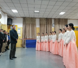 从学生寝室出来,江校长一行来到鹤鸣楼舞蹈排练室,视察了舞蹈教研室马平老师《蒙古舞》课堂和周妙老师《朝鲜舞》课堂。江校长与正在排练毕业晚会节目的19级舞蹈学班学生合影,他希望学生们在一师大家庭里好好生活,在老师们的培养下学好专业,苦练本领,成为对国家社会有用之才。