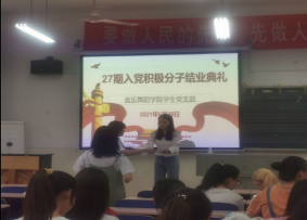 6月21日学生党支部在鹤鸣楼(北)303教室举行学院第27期学生入党积极分子结业典礼。80名通过入党积极分子培训班结业考试的入党积极分子领取结业证书。支部书记邓志刚主持结业典礼。