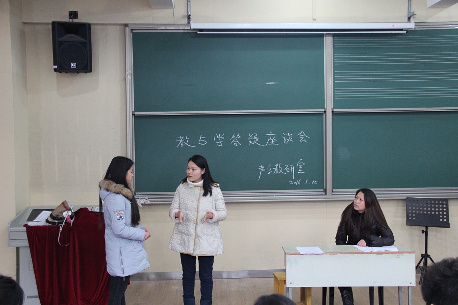 2016年1月11日下午两点,为促进我院声乐教程“教与学”的良性循环,了解声乐学习中学生的学习动态,我院声乐教研室雷惠玲、殷士琳、许启雪、刘佳蓉、徐彪、杨思思等老师开展了一场针对大一大二大三声乐主修学生的“教与学”声乐座谈会。