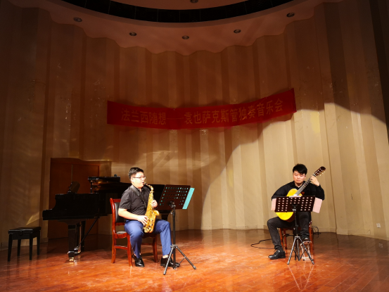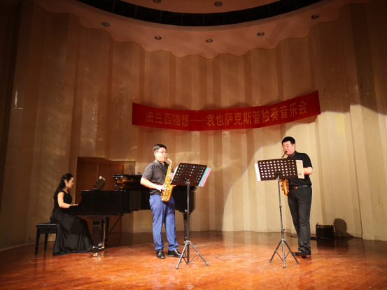 音乐会开场由袁也老师带来两首法国中音萨克斯管独奏作品《随想与变奏》与《升C大调奏鸣曲》与一首法国现代先锋派作品《风》。随后袁也老师与特邀嘉宾凌晨曦老师共同演绎一首萨克斯管与吉他二重奏经典作品《探戈的历史》。音乐会的最后由袁也老师与特邀嘉宾谭娜老师、邢海春共同献上萨克斯管与钢琴三重奏作品《查尔达什》将整场音乐会推向了高潮。