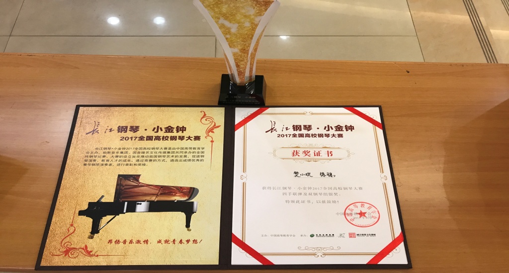 我院樊小欢、徐稳两位青年教师参加了该项赛事中四手联弹及双钢琴组的比赛,以湖南赛区第一名的优异成绩晋级全国总决赛。决赛中,她们遇到了强大的竞争对手,另外的14组参赛选手分别来自14个不同的分赛区,他们也都是各赛区的第一名获得者。樊小欢、徐稳老师以优秀的专业技能和过硬的心理素质,凭借两人默契的配合,稳定的发挥赢得了四手联弹及双钢琴组全国第二名的佳绩,再次为我校争得了荣誉。