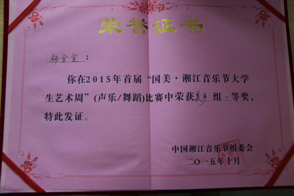 我院由华娟老师带队,在为期5天的参赛中,取得了以下优异成绩:声乐组,由崔思蕖教授指导的学生杨金金荣获美声组一等奖,由何念忠副教授指导的学生陈鹏荣获美声组三等奖;由肖兵副教授指导的学生刘璇荣获民族组三等奖;由郭宇博士指导的学生罗佳浩荣获通俗组三等奖。舞蹈组,由李琪老师指导的学生左晚婷荣获单双三人组舞蹈二等奖;由李琪老师指导的14级舞蹈表演1班群舞《喜鹊喳喳喳》荣获舞蹈群舞三等奖。