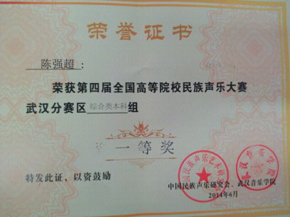 在2014年6月11日举行的“第四届全国民族声乐大赛武汉赛区”的比赛中,我院参赛同学不畏强手,奋勇拼搏,从30多所参赛高校的近100名选手中脱颖而出,其中,陈强超荣获综合类本科组一等奖,邱慧君、周如佩荣获综合类本科组二等奖。陈强超将代表我院参加全国民族声乐大赛的半决赛。