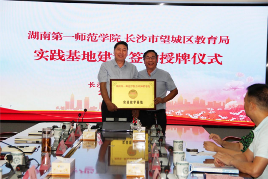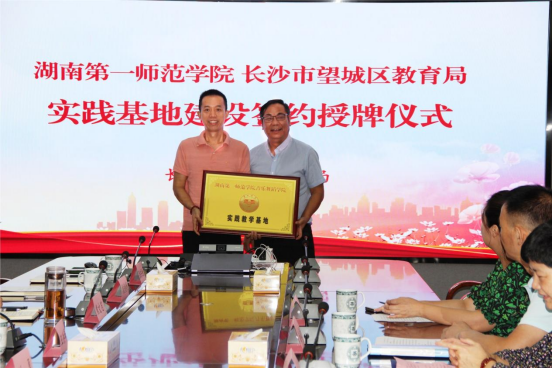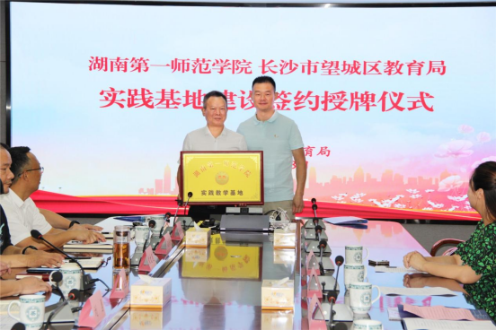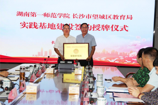 最后,在大家的共同见证中,由湖南第一师范学院教务处副处长汤希玮与长沙市望城区教育局副局长刘勇就实践基地合作项目进行签约并授牌。