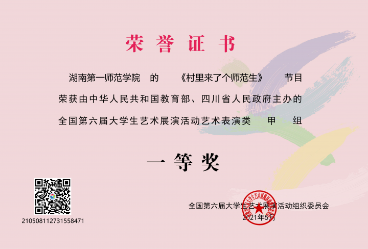 2021年06月30日在刚刚结束的第六届大学生艺术展演活动中,我院肖翔和李琪老师创编并指导的歌舞剧《村里来了个师范生》获艺术表演类一等奖,杨丹老师撰写的美育案例《基于“U—S—C”共同体的乡村美育教师培养模式》获...